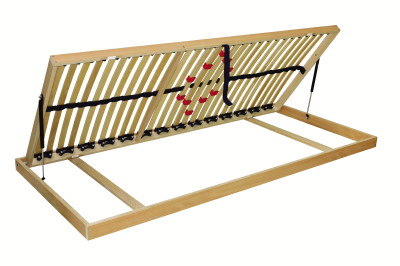 Lattenrahmen mit 28 Federleisten. Starre Ausführung, Lademöglichkeit unter dem mittels Hydraulikunterstützung geöffneten Lattenrahmen. Der Lordosebereich ist im Härtegrad verstellbar.